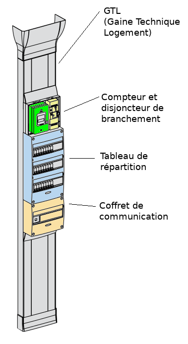 La GTL se trouve dans un endroit dédié appelé ETEL pour Espace Technique Electrique du Logement, et d’une dimension minimum de 60 cm de large, 25 cm de profondeur, et d’une hauteur totale du sol au plafond.