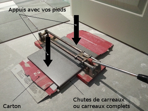 Ensuite, vous posez un pied de chaque côté de la rayure de coupe, et vous utilisez tout le poids du corps pour provoquer la coupe du carreau.