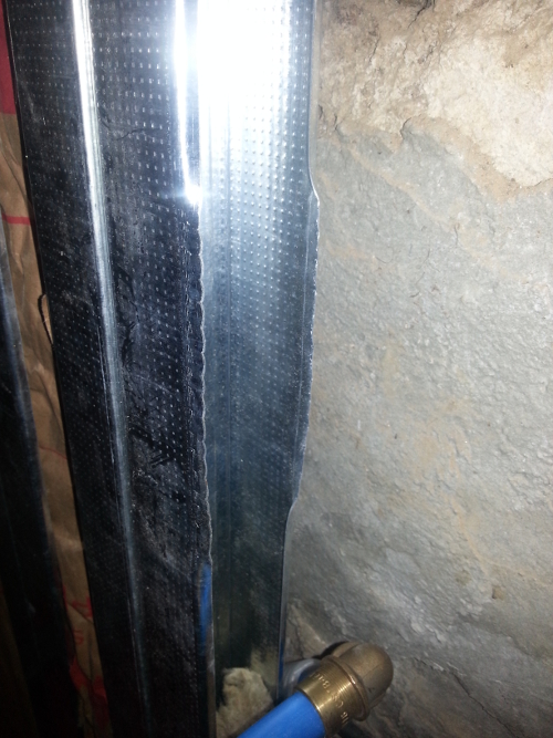 En ajoutant de la sorte des chevrons entre les montants, non seulement on ajoute une possibilité de fixation solide là où il n’y en a pas, mais en plus on transfert la charge sur les montants métalliques qui repose sur le sol.