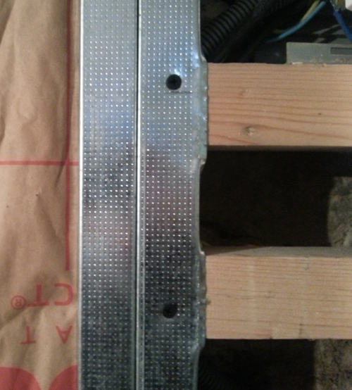 Bien entendu, on n’oublie pas de visser le chevron avec les montants (vis à placo de 3,5cm de longueur et vissées profondément de façon que la surface des têtes arrive au raz de la surface des montants pour éviter des surépaisseurs) :