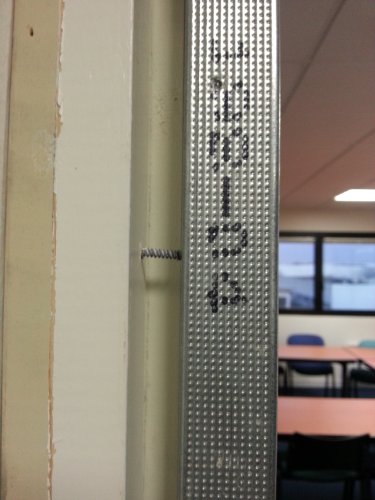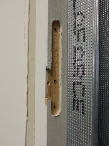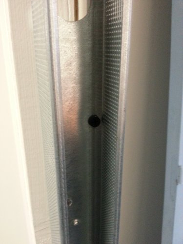Et ici, une des vis plus courtes, positionnée au bord du montant pour être sûr d’être dans le bâti en bois :
