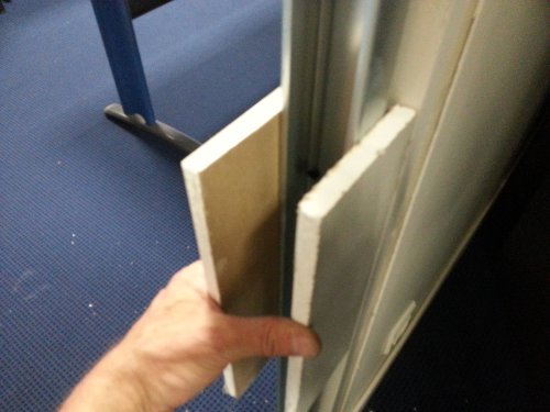 Pour cela, utilisez des chutes de placo (BA13), que vous positionnerez comme sur la photo suivante, de façon que les chutes soient exactement dans l’alignement des surfaces de la cloison :