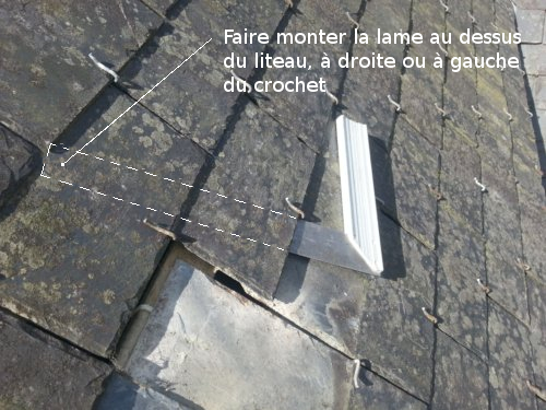 Et pour cela, il faut glisser la lame assez loin, sous deux ardoises, pour se placer sur le liteau sur lequel est accroché… le crochet supérieur !