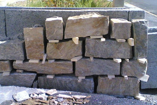 En plus du mortier, pour vous aider dans le bon maintien des pierres, vous pouvez, comme je l’ai fait ici, utiliser de petites cales en bois. Des petits morceaux de liteau feront parfaitement l’affaire.