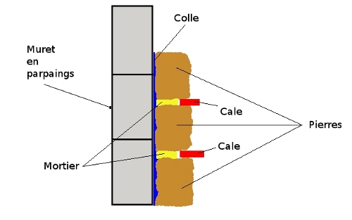 Si vous comptez utiliser des plaquettes de pierre de parement, donc de faible épaisseur (2-3 cm), un collage « simple » est suffisant.