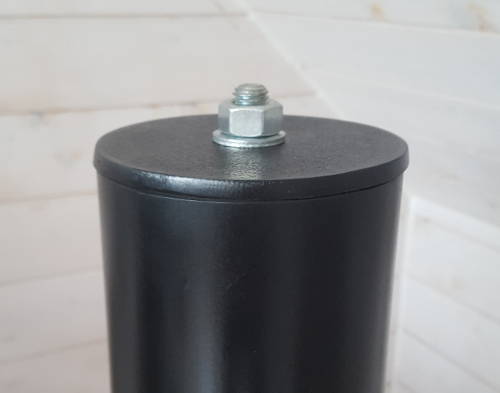 Quand le palier est fixé, on enfilera sur le reste du tube central restant apparent sur environ 1m, plusieurs entretoises (ici 4 et d’une longueur plus grandes que les autres*), et on terminera par un disque, une rondelle et un boulon bien serré :