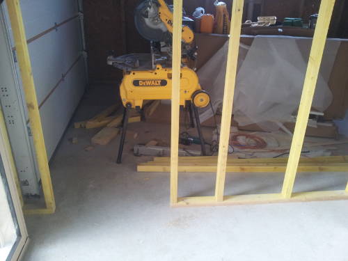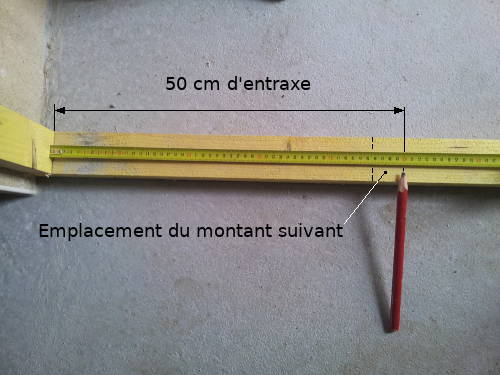Sauf coup de chance exceptionnel, le montant au bord de l’ouverture de la porte aura certainement un entraxe inférieur à 50 cm, comme c’est le cas ci-dessous une fois un premier côté d’ossature terminé :