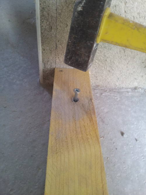 Comme vous le devinez sur les photos précédentes, la lisse basse (le chevron posé au sol) est fixé sur sa grande largeur, à savoir sur ses 63 mm (plus simplement dit : chevron posé à plat 😉 ! )
