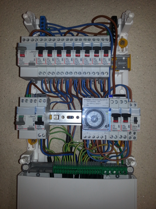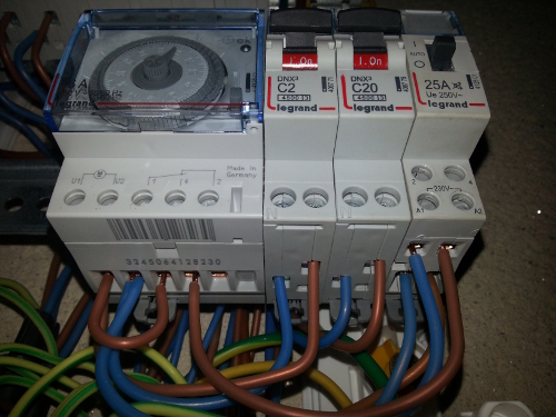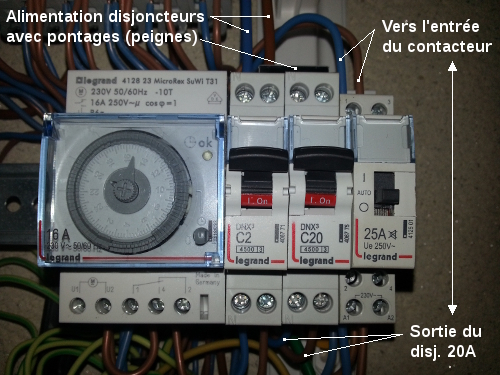 A savoir : l’horloge, le contacteur, et deux disjoncteurs, un de 2A pour protéger l’horloge, l’autre de 20A pour protéger l’appareil à commander (ce calibre de 20 A peut être diminué en fonction de l’appareil à commander, mais qui peut le plus… peut le moins 😉 !)