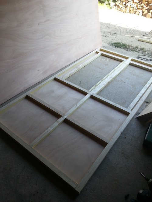 Je lui propose alors une porte de ma conception, d’une épaisseur standard de 40mm, qui aura l’apparence d’une solide porte d’entrepôt et la légèreté d’une porte intérieure, car composée d’une structure interne en tasseaux de 30 mm, et recouvert de chaque côté de panneau de contreplaqué de 5 mm d’épaisseur.