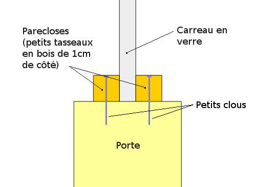 Les futurs carreaux seront maintenus par des pare-closes composés de petits tasseaux en bois pointés, et cela tout autour du carreau suivant ce principe :