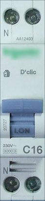 Si vous regardez bien la valeur du disjoncteur, vous verrez un calibrage de 16A (le C16 sur la photo suivante) :