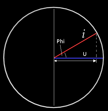 Quand la tension U est maximum (à l’horizontal sur le dessin), l’intensité i est en retard à cause de l’angle Phi de déphasage.