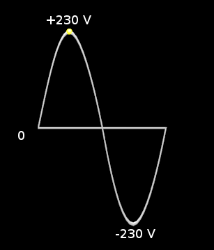 La tension maximale est donc ici +230 V ou – 230 V soit 230 V alternatif :