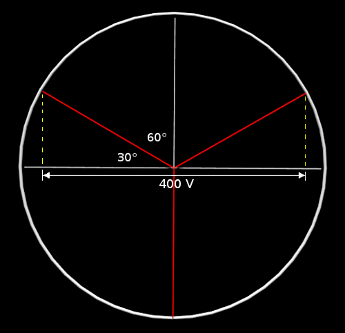 La tension maximum entre 2 phases (on mesure les deux du dessus) sera obtenue quand les phases seront dans la disposition du schéma ci-dessus, c’est à dire une passant par le zéro (vers le bas sur le schéma), et les deux autres avec un angle de 30° par rapport à l’axe horizontal.