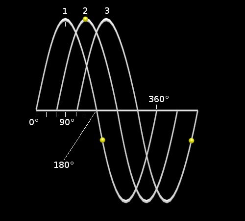 Dans la production du courant triphasé, ce sont 3 tensions de 230 V qui sont produites de façon « décalées dans le temps », déphasées de 120° les unes des autres.