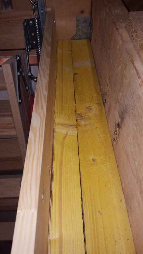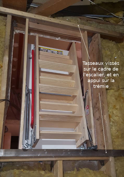 Ici, la trémie ayant une largeur d’environ 80 cm et l’escalier à peu près centré dans ces 80 cm, j’ai choisi de combler les 10 cm de chaque côté par des morceaux de chevrons solidement vissés dans les solives, et le cadre de l’escalier vissé dans ces chevrons.