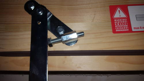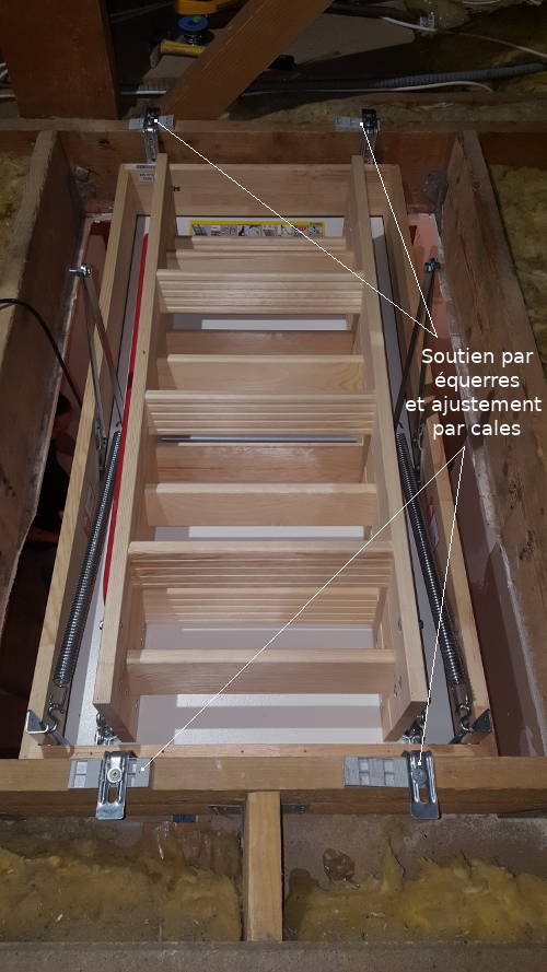 Le réglage de l’angle d’ouverture définissant la pente de l’escalier se fait à l’aide des vis en début de bras métalliques articulés visibles sur la photo ci-dessus.