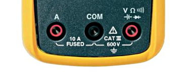 Sur la photo ci-dessus, le fil noir sera connecté sur la borne noire « COM » (Commun, neutre), et le fil rouge sur la borne rouge de droite si l’on veut mesurer une tension (V pour tension).