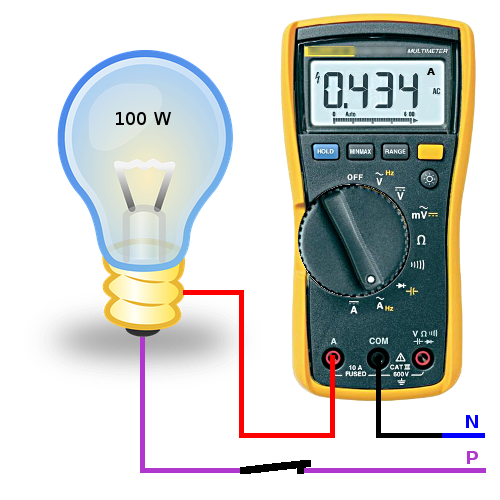 L’ampoule de 100 W ci-dessus est alimentée par une tension de 230 V à partir du tableau (la phase P et le Neutre N) quand l’interrupteur est fermé.