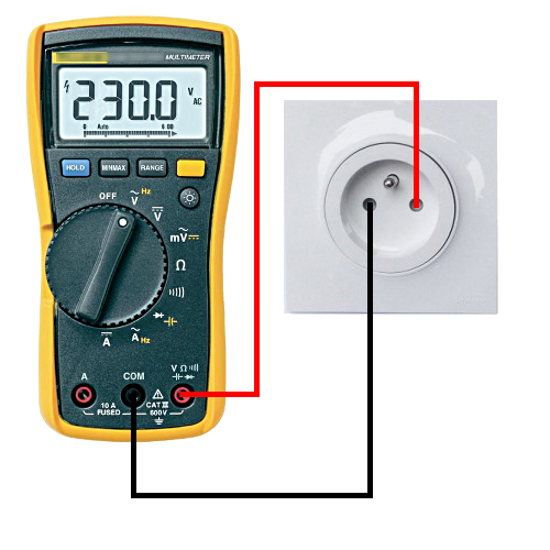 Même si la mesure d’une tension alternative peut se faire indifféremment en inversant les fils rouge et noir, je vous recommande de toujours respecter la connexion fil noir sur borne noir et fil rouge sur borne rouge, et lors de la mesure, la pointe de touche noir sur les fils de neutre (–) et la pointe de touche rouge sur les fils de phase (+).