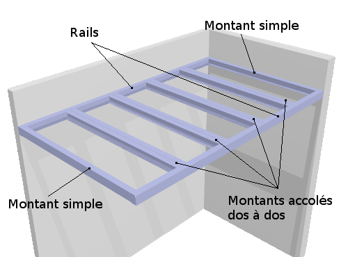 Les rails et les montants simples seront percés et fixés aux murs, en suivant bien entendu une parfaite horizontalité 😉 !