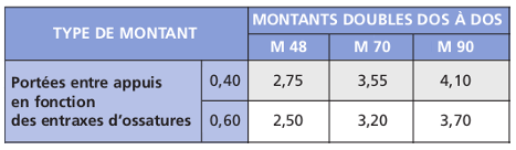 Exemple de lecture du tableau : si vous avez une largeur de plafond de 3,55m (Portée entre appuis), vous utiliserez des montants de 70mm de large (M70), que vous placerez tous les 40cm (0,40) d’entraxe.
