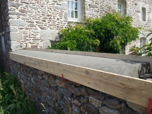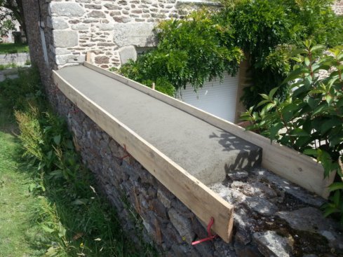 Première chose à faire comme ce mur est en pierres avec une partie supérieure fragile et très irrégulière, coffrer et réaliser un dessus parfaitement plan, comprenant une partie horizontale pour permettre la fixation de notre brise-vue, et une seconde avec une pente permettant l’écoulement des eaux de pluie.