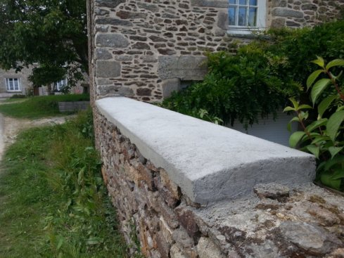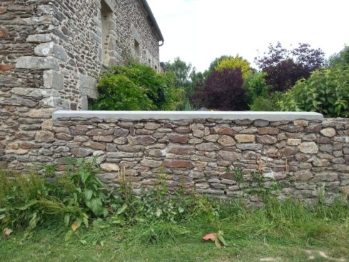 … pourquoi pas un petit badigeon blanc cassé (à la chaux ?) pour redonner un air de rusticité au « chapeau » du mur de pierres ?