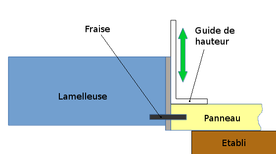 Une fois le panneau correctement maintenu sur un établi ou un support stable, il suffit de positionner la lamelleuse (voir schéma plus bas) et de « l’enfoncez » dans le panneau.