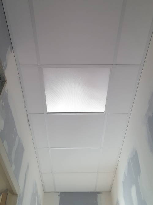 Quand la structure du plafond est terminé, il n’y a plus qu’à combler chaque carré avec une dalle décorative ou avec un panneaux lumineux :