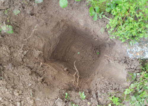 Un trou peut devenir carré à cause de la rencontre de cailloux, ou parce qu’il a été agrandit à la bêche pour garantir un bon positionnement de la pergola.