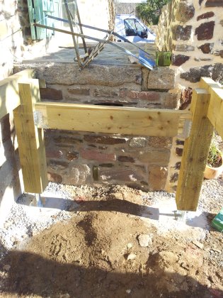 Ayant besoin d’approcher les bastaings au plus prés du palier de cette maison (et idem de l’autre côté de la terrasse), j’ai opté pour la mise en place d’une traverse de soutien comme l’illustre la photo ci-dessous.