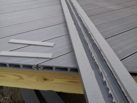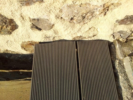 IMPORTANT : si vous utilisez des lames creuses comme c’est le cas ici, avant de fixer chaque lame, bouchez les extrémités côté mur. En effet, compte tenu de la légère pente appliquée à la terrasse pour que l’eau s’évacue, cette eau peu aussi s’infiltrer à l’intérieur des lames si celles-ci ne sont pas « fermées ». Et en cas de gel, un éclatement est possible si les lames sont pleines d’eau ! Si votre mur est parfaitement droit, vous pouvez utiliser les clips de finition prévus à cet effet (voir plus bas). Ici, comme le mur est irrégulier, l’extrémité des lames est fermée par du mastic silicone gris (gris comme la terrasse 😉 )