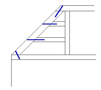Comme il est impossible de positionner un sabot sur une partie oblique, la fixation de cette dernière est assurée à chaque emplacement par 2 longues vis 6×120 (l’une au dessus de l’autre et espacée d’environ 10 cm), comme l’illustre le schéma suivant (vue de dessus) :
