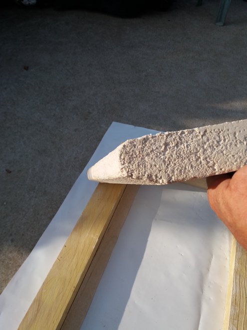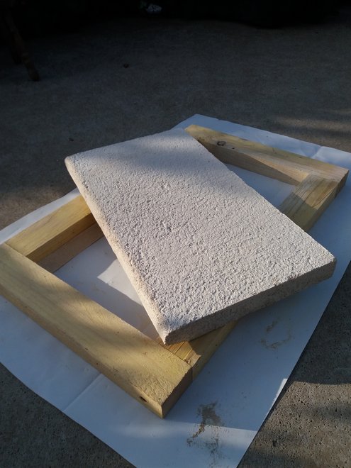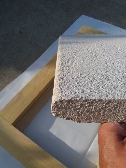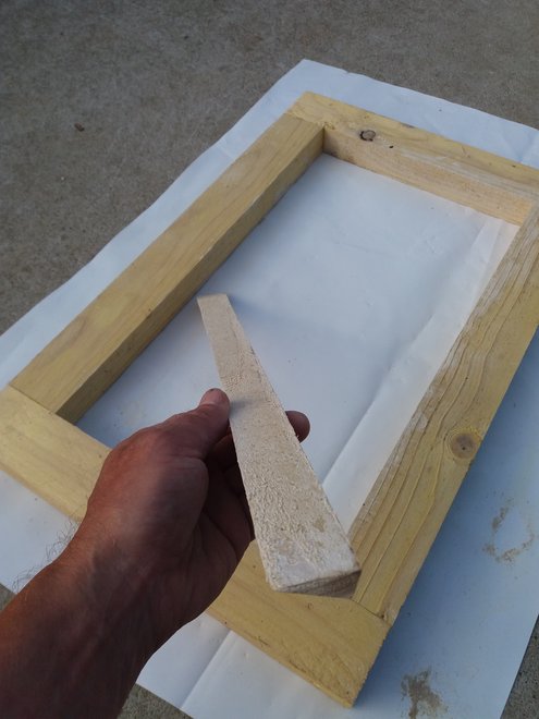 Pour la partie supérieure, comme on souhaite une surface antidérapante, on fera coulisser en alternant le sens un tasseau de bois en appui sur les cotés du moule.