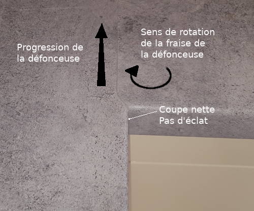 De ce côté, la fraise ressortira du plan à 45°… en éclatant le stratifié 🙁 !