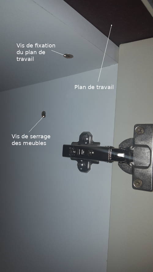 Cette opération se fait par en dessous, en effectuant un pré-perçage à travers le haut des meubles avec une petite fraise pour que les têtes de vis affleurent la surface :