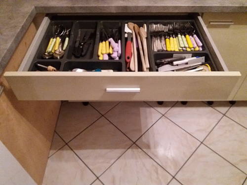 Ce dont je rêvais, et vous allez peut-être trouver ça ridicule, c’était d’avoir un grand tiroir à couverts, juste sous le plan de travail de la table de cuisson.