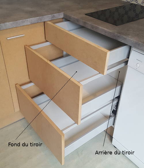 Avec ce kit vous n’avez que 2 petits pièces de bois à découper dans un panneaux mélaminé de 16mm (et non pas 18mm), le fond (le bas du tiroir) et l’arrière.