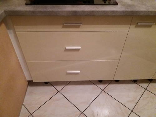 Tiroirs peints en finition laquée (sans la plinthe et sans les éléments d’angle à gauche)