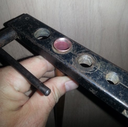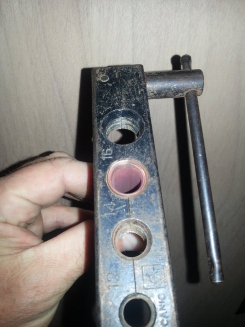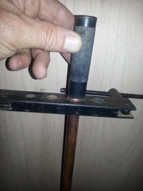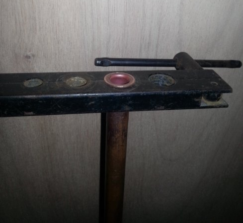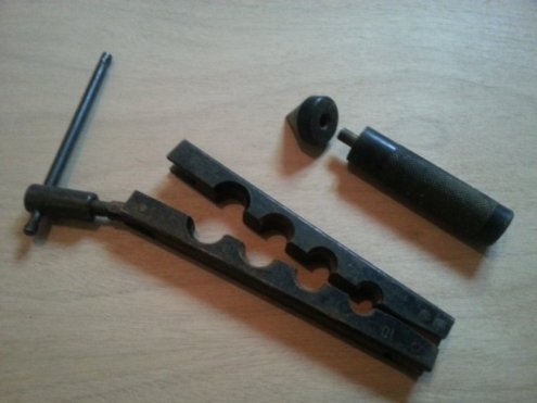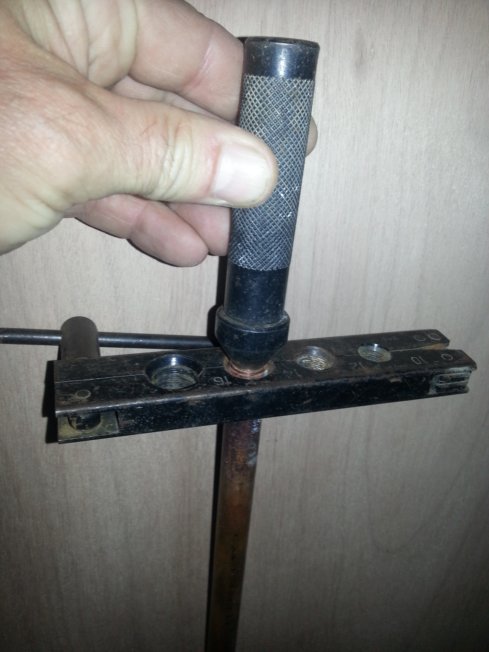 Donc, pour réaliser des collets battus, vous aurez besoin de ce kit, composé d’une matrice (étau à trous) dans laquelle sera maintenu votre tuyau en cuivre, et d’un « pointeau » équipé d’une partie conique amovible (coût de ce kit entre 30 € et 50€ suivant le modèle) :