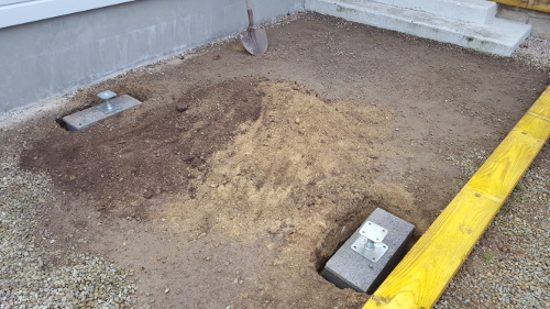 Deux pieds de poteau réglables posés chacun sur un demi parpaings pleins ont été utilisés.