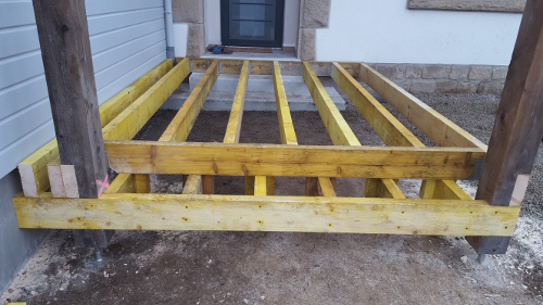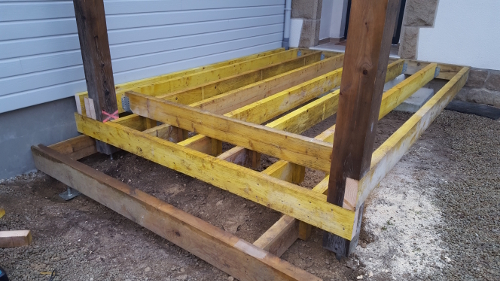 En effet, la simple pose d’un bastaing (de section 6,5 x 18 cm) sur la deuxième marche a permis d’atteindre la hauteur nécessaire pour qu’une fois les lames de terrasse posées le niveau fini soit au niveau du seuil de la maison (voir la photo ci-dessous) !