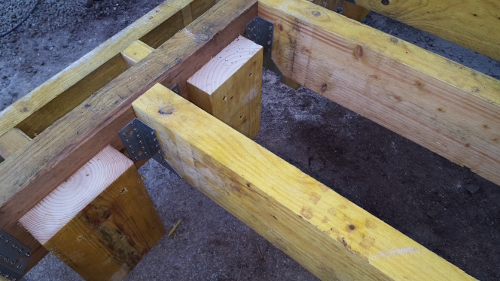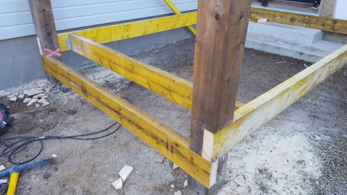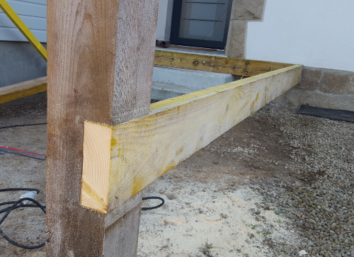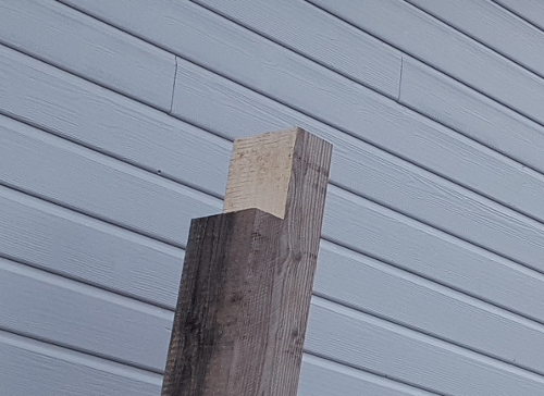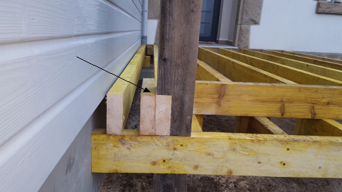 Pour pouvoir entourer le poteau de gauche avec les lames de terrasse, un morceau de bastaing (identifié par la flèche ci-dessous) à été vissé :