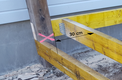 Voici une vue d’ensemble du cadre et de la position des bastaings pour la création des marches (la croix rose sur le poteau de gauche est involontaire, elle était déjà présente lors de l’achat) :