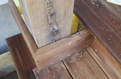 On peut donc utiliser verticalement des chutes de bastaing, et les fixer solidement à la structure initiale à l’aide de vis 6x120mm, puis visser à son tour un bastaing horizontal en partie basse :